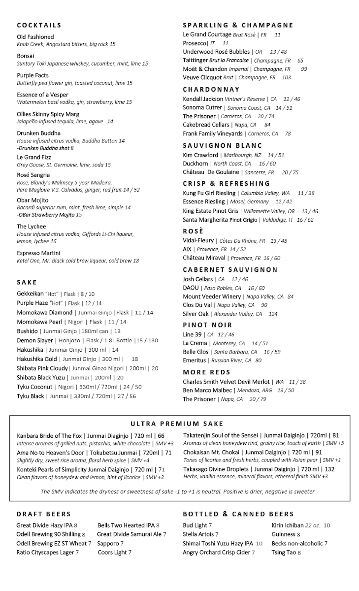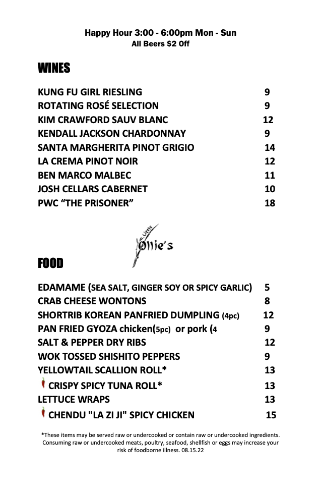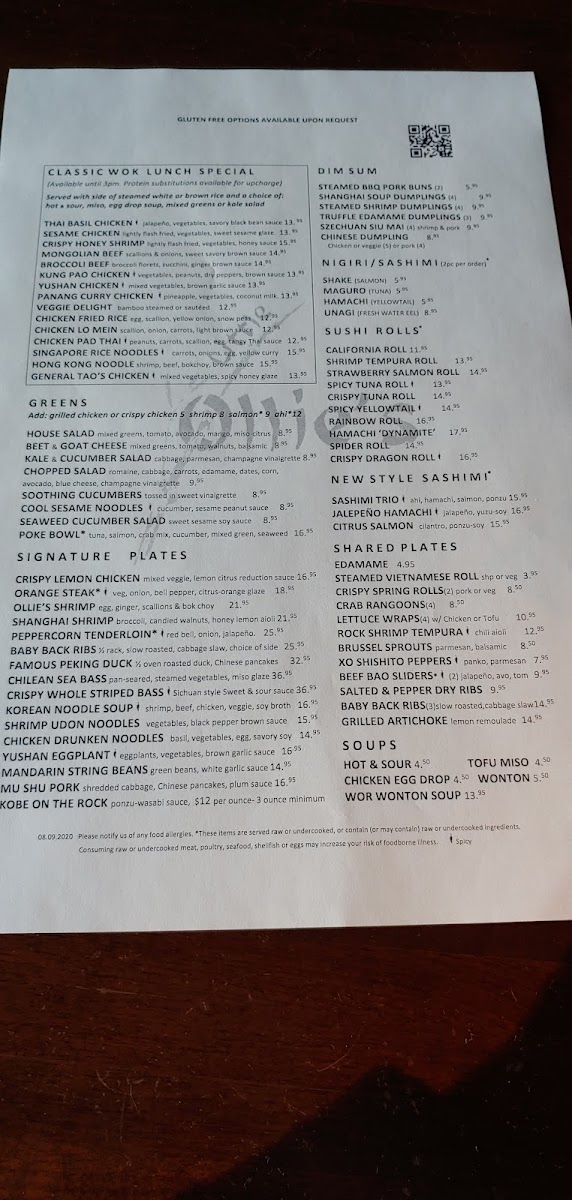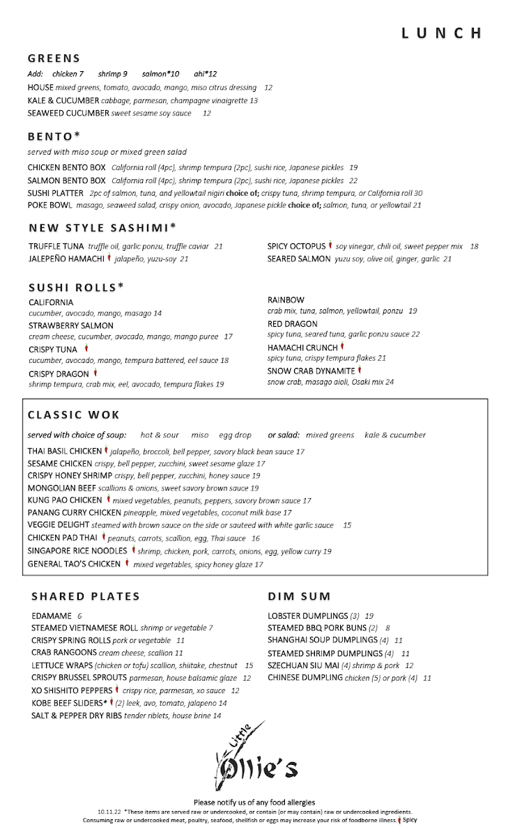 The menu at Little Ollie's offers a diverse selection of Asian fusion cuisine, focusing primarily on Chinese and Japanese dishes. It is structured into several distinct groups, catering to a variety of dining preferences and occasions.